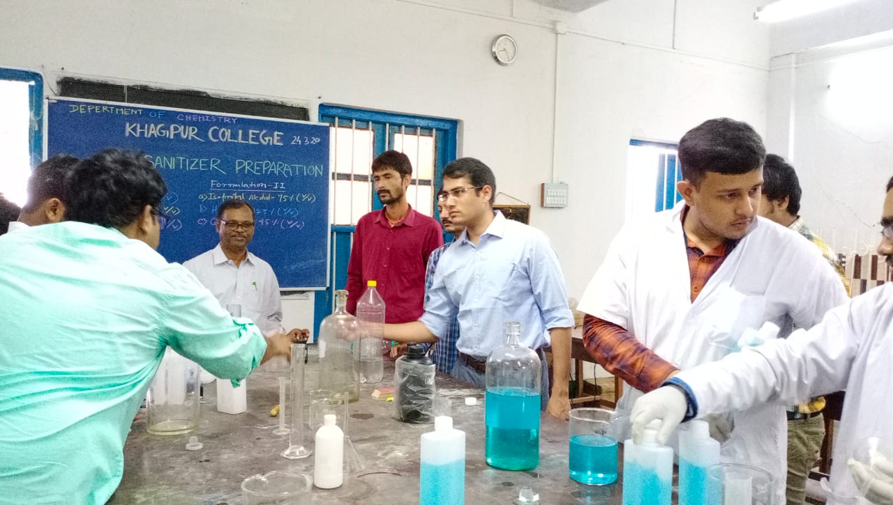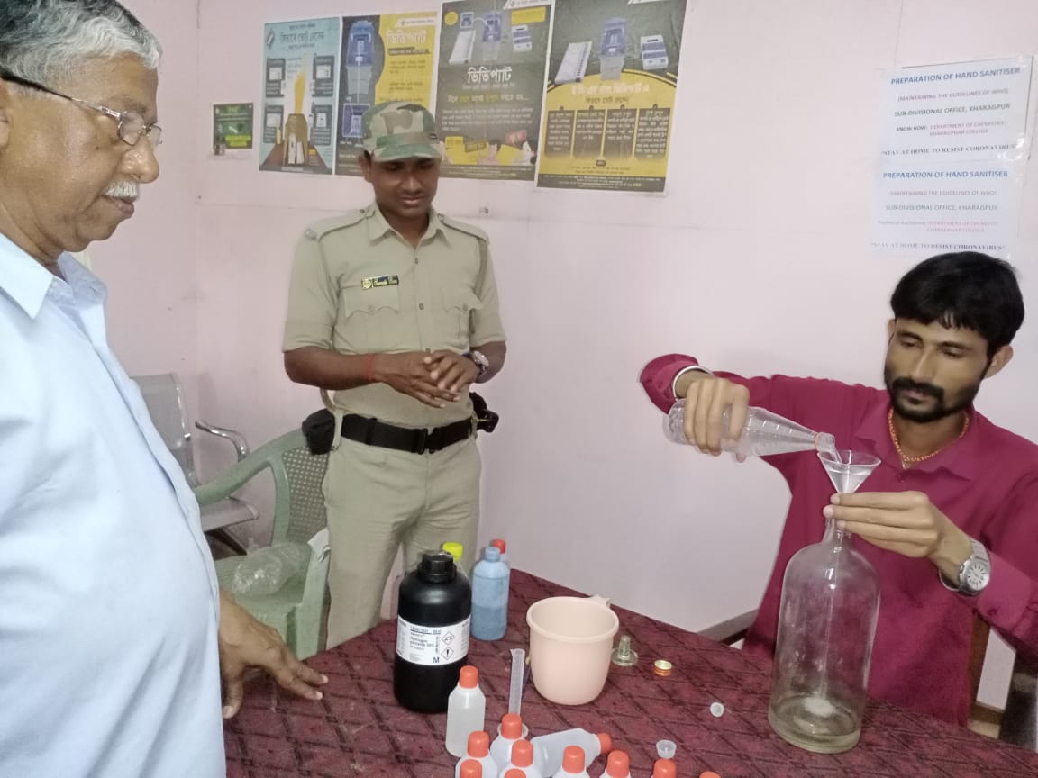 Prof. Indranil Chakraborty of the Department of Chemistry said that with the help of ethanol, glycerin and distilled water, hydrogen paraoxide can be made cheaply as a sanitizer and can add methylene blue for color, while making 100 mL will cost only Rs 72. Students who were prepared sanitizer were Suman Mukherjee, Amlan Bhattacharya, Ritam Das, Amitava Manna. After learning the method, the employees of the SDO office made sanitizers today. Due to demand and unavailability of sanitizer in the market, people are suffering.Hope this initiative will help to tackle with crisis.