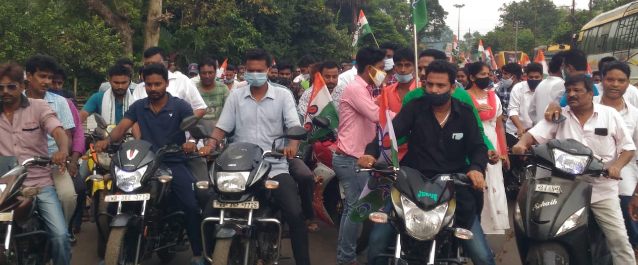 kharagpur, Tmc organised a Bike rally on sunday evening from Surya Sen more Inda to vivekanda statue Malancha against privatization policy of central govt services including Rlys. pradip sarkar Mla kgp sadar, rabi shankar pandey, debashish chowdhry, Md Akbar, Sk hanif & other leaders marched in rally.