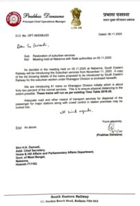 खड़गपुर। 11 नवंबर से कुल 81 ट्रेनें चलाने की तैयारी खड़गपुर रेल मंडल ने किया है सब कुछ ठीक रहा तो अपने पूर्व निर्धारित समय पर उक्त ट्रेनें चलेगी। द पूरेलवे के सीपीटीएम प्रभास दनसना ने राज्य के एडिशनल चीफ सेक्रेटरी एच के द्विवेदी को इस संबंध में शुक्रवार को पत्र लिखा है।