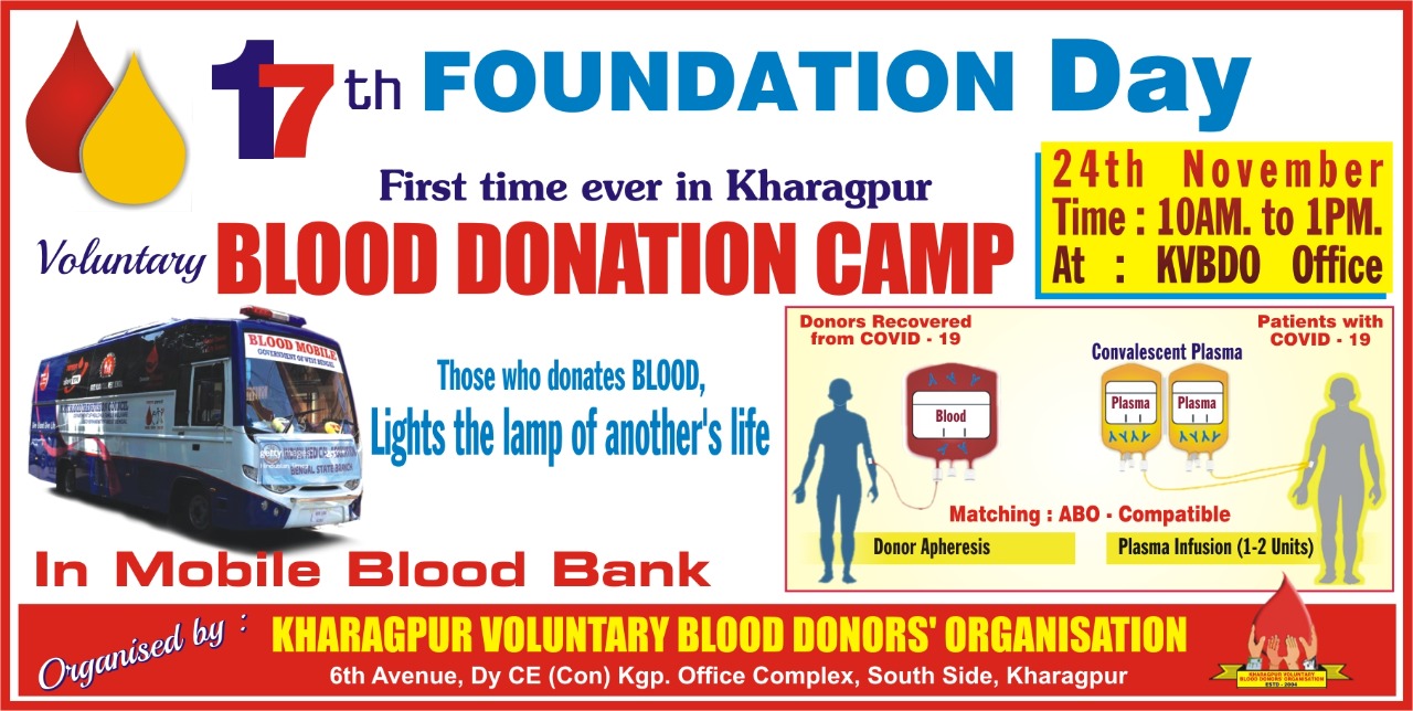 kharagpur,On *24th Nov. (Tuesday) KVBDO celebrates its 17th FOUNDATION DAY* We have arranged for a Vol. Blood Donation Camp at Kvbdo office premises, in a highly equipped Govt. Mobile Blood Bank.(AC Bus) from 10:00 AM to 1:00 PM.
