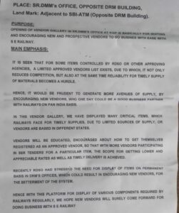 खड़गपुर । रेल टेंडरों में वेंडरों की संख्या बढ़ाने के लिए रेल वेंडर गैलरी का उद्घाटन सीनियर डीएमएम कार्यालय के समक्ष किया गया। गैलरी के उद्घाटन
