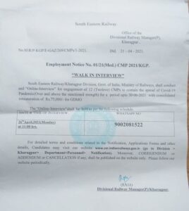 साक्षात्कार होगा। डीआरएम (पर्सनल) खड़गपुर की ओर से जारी किए गए नोटिस में 30 जून तक के लिए नियुक्ति होगी। रेल सूत्रों से पता चला है कि रेल मुख्य अस्पताल में डाक्टरों की कमी व महामारी को देखते हुए उक्त नियुक्ति की जा रही है। इच्छुक अभ्यर्थी ज्यादा जानकारी के लिए www.ser.indianrailways.gov.in विजिट कर सकते हैं।