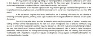 इंद्र किशोर मिश्र का कहना है कि अस्पताल के आउटडोर व विभिन्न वार्डों के शौचालयों में गंदगी की भरमार है जिससे रोग बढ़ने का खतरा है। उन्होने ओपीडी के समक्ष जलजमाव, पेयजल का अभाव व अन्य मुद्दों की भी शिकायत कर जिलाशासक सहित विभिन्न अधिकारियों को मामले में संज्ञान लेने की अपील की है।