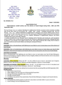 मनोज कुमार साह:- तूफानी बारिश कि मार का एक और कहर राज्य मे आने कि चेतावनी राज्य सरकार कि ओर से आज जारी किया गया हैं। गौरतलब है कि पहले से पूर्वानुमान के आधार पर आज नवान्न से प्रेस नोट जारी कर जानकारी कराया कि आने वाले 26-27 सितंबर को उत्तरपूर्व बंगाल से लेकर झारखंड, उड़ीसा, तेलंगाना और आंध्र के कुछ जिले के लिए चेतावनी जारी किया गया है। पूर्व और पश्चिम मेदिनीपुर , झाडग्राम, पुरुलिया,पूर्वी बर्दवान, बांकुड़ा के लिए विशेष सतर्कता चेतावनी जारी किया गया हैं।