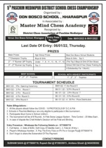 kharagpur, 5th paschim medinipur district school chess Tournament has been announced on Thursday. It is going to be organized by Don Bosco School, Kharagpur aided by Master Mind Chess Academy.