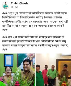 हरीश ने अपने पद पर दावा करते हुए कहा कि जिला कमेटि से जो सूची उसे मिला है उसमें लाइट एब्युटीफिकेशन पर उसका नाम है। इस संबंध में चेयरमैन का कहना है कि जिला पदाधिकारियों की ओर से जारी सूची में त्रुटि है प्रबीर को लाइट एंड ब्युटीफिकेशन दिया गया है। टीएमसी के खड़गपुर शहराध्यक्ष दीपेंदु पाल का भी कहना है कि सूची में परिवर्तन किया गया है हरीश व प्रबीर के विभाग को आपस में अदला बदली किया गया है पर इस बात से टीएमसी नेता देबाशीष चौधरी इत्तेफाक नहीं रखते उन्होने कहा कि जिला अध्यक्ष सुजय हाजरा व जिला कन्वेंनर अजित माईति के हस्ताक्षर वाले जो सूची जारी हुई है वे लोग उसे ही मानेंगे अब देखना है कि अंत में विभाग किसे मिलता है मामले को लेकर गुटबाजी बढ़ेगी या नेतृत्व मामले को संभाल लेंगे।