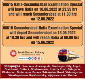 08045 Hatia-Secunderabad Examination Special will leave Hatia on 12.06.2022 at 23.55 hrs and will reach Secunderabad at 11.30 hrs on 14.06.2022. In the return direction, 08046 Secunderabad-Hatia Examination Special will depart Secunderabad on 15.06.2022 at 19.30 hrs and will reach Hatia at 06.00 hrs on 17.06.2022.