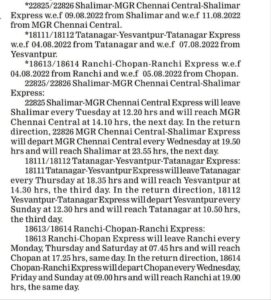 *गाड़ी सं 18613/18614(रांची-चोपान-रांची एक्सप्रेस)–04/08/2022 को रांची से एवं 05/08/2022को चोपान से लागू होगी।