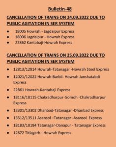 The agitation and rail blockade is still continuing at Kastaur and Khemasuli stations of South Eastern Railway. Therefore, the normal train service of SER is severely affected over Adra and Kharagpur Divisions.