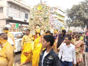 खड़गपुर, खड़गपुर नगरपालिका के वार्ड 10 के पार्षद बी हरीश ने आज पुरोहित बन सोलापुरी माता अपने सिर में उठा शोभायात्रा में शामिल हुए। पार्षद हरीश का कहना है कि उन्होने माता से मन्नत मांगी थी जिसके परिणामस्वरुप कुल तीन माता की शोभायात्रा निकाली गई। इस अवसर पर हरीश खुद पुरोहित बने. मां की सवारी हरीश के आवास से मलिंचा सेन चौक स्थित सोलापुरी माता मंदिर गई जहां पूजा अर्चना के बाद अन्नदान भी किया गया।