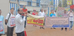 রাজ্যজুড়ে স্কুল, কলেজ, অফিস,আদালত কর্মরত- রাজ্যের তহবিল থেকে বেতনভুক্ত কর্মচারী ও সাধারণ মানুষের দাবিতে সংগ্রামী যৌথ মঞ্চ ডাকে।আজ ধর্মঘট। কর্মচারীদের ৩টি দাবি নিয়ে এই ধর্মঘট– ১)উচ্চ আদালতের রায় মেনে AICPI অনুযায়ী কর্মচারীদের D.A. দিয়ে দিতে হবে। ২) সমস্ত সরকারি পদ স্বচ্ছতার সাথে নিয়োগ করতে হবে। ৩) যোগ্যতার ভিত্তিতে অস্থায়ী কর্মচারীদের স্থায়ী করতে হবে। দাবি গুলি নিয়ে আজ খরগপুরের অবসরপ্রাপ্ত ও বর্তমান শিক্ষক ও কর্মচারীবৃন্দ খরগপুর পৌরসভা অফিসে ধর্মঘটের সমর্থনে বিক্ষোভ ও পিকেটিং করা হয়। পৌরসভার কর্মচারীদের কাজের যোগ না দিতে অনুরোধ জানানো হয়। বিভিন্ন দপ্তরের কর্মচারীরা রাজ্য সরকারের বেলাগাম খরচার বিরুদ্ধে এবং D.A. তাদের অধিকার আলোচনা করেন। খরগপুর পৌরসভায় নামমাত্র কয়েকজন স্থায়ী কর্মচারী, বেশিরভাগ অস্থায়ী কর্মচারীদের কাজ করানো হচ্ছে, তার বিরুদ্ধেও প্রতিবাদ জানানো হয়। দু’ঘণ্টা ধরে এই বিক্ষোভ কর্মসূচি চলে।