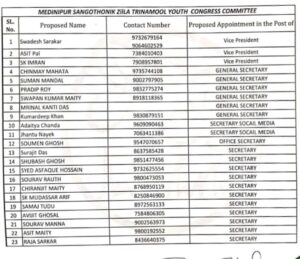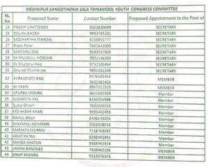तृणमूल युवा कांग्रेस के उपाध्यक्ष पुनः असित पाल को बनाया गया है। ज्ञात हो कि इससे पहले भी वह पद पर रह चुके हैं राजा सरकार को सचिव बनाया गया है।