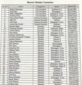 পূজা নাইডুকে টিএমসি জেলা মহিলা মোর্চার সম্পাদক করা হয়েছে। এছাড়াও খড়্গপুর শহর থেকে কাউন্সিলর জয়শ্রী পাল, দাবায়নী পাত্র, মিতা দাস এবং রূপালী সাহু এবং হেমা চৌবেকে সদস্য করা হয়েছে। জানা যায়, হেমা চৌবে ইতিমধ্যেই মহিলা মোর্চার রাজ্য কমিটিতে রয়েছেন। হেমা জানান, যেহেতু তিনি রাজ্য কমিটির একজন পদাধিকারী, তাই তাকে জেলায় সদস্য হিসেবে অন্তর্ভুক্ত করা হয়েছে।