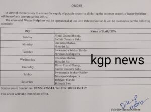 খড়্গপুর, শহর হোক বা প্রত্যন্ত গ্রামীণ এলাকা, গ্রীষ্মকালে মানুষকে পানীয় জলের সংকটের মধ্যে দিয়ে যেতে হয়, এই বিবেচনায় প্রশাসন একটি হেল্পলাইন নম্বর জারি করেছে যাতে লোকেরা কল করে তাদের সমস্যার সমাধান করতে পারে। সাংবাদিকদের সঙ্গে কথা বলতে গিয়ে খড়্গপুরের এসডিও দিলীপ মিশ্র বলেন, খড়্গপুর মহকুমার সমস্ত ব্লকের জন্য নম্বর জারি করা হয়েছে। সাত দিনে মানুষ ফোন করে তাদের সমস্যার কথা জানাতে পারবে। সিভিল ডিফেন্সের অধীনে ওয়াটার হেল্পলাইন কাজ করবে।