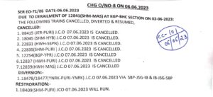 3)    22831 Howrah-Sathya Sai Prashanthi Nilayam Express journey commencing on 07.06.2023 will remain cancelled