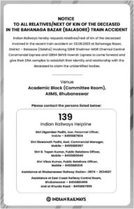 कोरोमंडल एक्सप्रेस व SMVB हावड़ा एक्सप्रेस दुर्घटना में मारे गए लोगों के परिजनों के शव की शिनाख्ती के लिए डीएनए जांच का आह्वान, रेल मंत्री अश्विनी वैष्णव 21 को बालासोर में ,प्रधानमंत्री मोदी भी वर्चुअल जुड़ेंगे, जगन्नाथ एक्सप्रेस, गरीब रथ सहित कुल आठ ट्रेनें 18 जून से चलेगी, 19 जून की रद्द ट्रेनों की सूची जारी