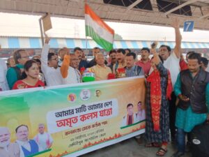 First Amrit Kalash Yatra Special Train was flagged on 28.10.2023 from Ranchi station. Shri Sanjay Seth Hon’ble MP flagged off this train. The Special train carried 507 delegates with Amrit Kalash containing sacred soil from Jharkhand.