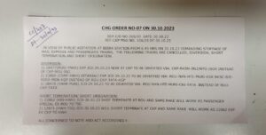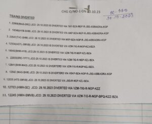 - 13288 Rajendranagar-Durg Express journey commencing on 29.10.2023 will run on diverted route via Tatanagar-Chandil-Muri-Hatia-Nuagaon-Rourkela.
