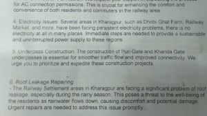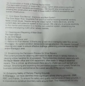 रेल दुकानों के भाड़ा व बिजली समस्याओं पर भी ध्यान आकृष्ट किया गया इसके अलावा रेल इलाके में बीएनआर सहित विभिन्न खेल मैदानों के रखरखाव व फेंसिंग के मुद्दे भी उठाए गए। रेल कर्मियों के क्वार्टर को भी दुरुस्त करने की मांग की गई।