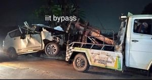खड़गपुर, एक्सीडेंट प्रोन जोन बने आईआईटी बाईपास में शनिवार की देर रात लगभग ग्यारह बजे इनोवा कार व डंपर दुर्घटनाग्रस्त हो गई