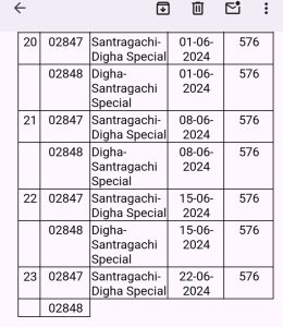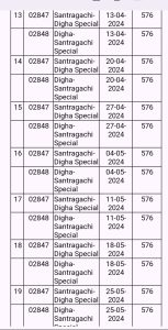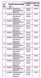 02863 Howrah – Yesvantpur Special will leave Howrah every Thursday at 12.40 hrs from 18.04.2024 to 27.06.2024 and will reach Yesvantpur at 00.15 hrs, the third day. In the return direction, 02864 Yesvantpur – Howrah Special will leave Yesvantpur every Saturday at 05.00 hrs from 20.04.2024 to 29.06.2024 and will arrive Howrah at 13.25 hrs, the next day.