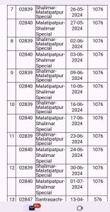 06081 Kochuveli-Shalimar Special will leave Kochuveli every Friday from 12.04.2024 to 31.05.2024 at 16.20 hrs and will arrive Shalimar at 13.40 hrs, the third day. In the return direction, 06082 Shalimar- Kochuveli Special will leave Shalimar every Monday from 15.04.2024 to 03.06.2024 at 14.20 hrs and will reach Kochuveli at 09.55 hrs, the third day.