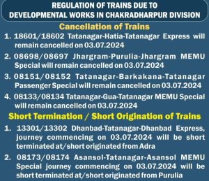 रथ यात्रा स्पेशल ट्रेनें चलेगी ,चक्रधरपुर रेल मंडल की कई ट्रेनें होगी बाधित
