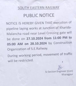 खड़गपुर, खरीदा खरीदा लेवल क्रासिंग के पास पाईपलाईन का काम होने के कारण रेल प्रशासन ने रविवार की रात 11 से सोमवार की सुबह पांच बजे तक ट्राफिक नियंत्रित करने संबंधी नोटिस लगाई है अतः आज देर रात खरीदा लेवल क्रासिंग के पास रो- के उपयोग से राहगीर बचें। ज्ञात हो कि पाइपलाइन का काम होने से शहर से जलापूर्ति सुचारु तौर पर होगी।