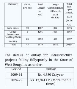 As on 01.04.2024, 43 projects (13 New Lines, 04 Gauge Conversions and 26 Doubling), of total length of 4479 Km, costing Rs. 60,168 crore falling fully/partly in the State of West Bengal including those which are in planning/approval/construction stage, out of which, 1655 km length been commissioned and an expenditure of Rs. 20,434 crore has been incurred upto March, 2024. The summary is as under:-