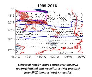 अध्ययन में बताया गया है कि वायुमंडलीय परिसंचरण में परिवर्तन कैसे होता है, विशेष रूप से रॉस्बी तरंगों का व्यवहार – पृथ्वी के रोटेशन द्वारा उत्पन्न बड़ी वायुमंडलीय तरंगें – इस प्रक्रिया में एक महत्वपूर्ण भूमिका निभाते हैं। ये लहरें वायुमंडल के माध्यम से प्रचार करती हैं, हवा के द्रव्यमान की गति को प्रभावित करती हैं और दबाव पैटर्न को बदल देती हैं। अध्ययन से पता चलता है कि SPCZ द्वारा प्रवर्धित ये लहरें, उच्च दबाव वाले सिस्टम को मजबूत करती हैं जो बर्फ की अलमारियों में गर्म हवा लाती हैं, सतह को पिघला देती हैं। यह वार्मिंग चक्र 1999 से अधिक लगातार और तीव्र हो गया है। इन दीर्घकालिक वायुमंडलीय परिवर्तनों के अलावा, अनुसंधान भी एल नीनो और दक्षिणी कुंडलाकार मोड जैसे अंतर-जलवायु घटनाओं के महत्व को रेखांकित करता है, जो अल्पावधि में एसपीसीजेड टेलीकनेक्शन के प्रभावों को बढ़ा या संशोधित कर सकता है। एसपीसीजेड, तीव्र उष्णकटिबंधीय तूफान गतिविधि का एक क्षेत्र, वायुमंडलीय टेलीकॉन के लिए एक शक्तिशाली इंजन के रूप में कार्य करता है-बड़े पैमाने पर वायुमंडलीय इंटरैक्शन जो दूर के क्षेत्रों को प्रभावित कर सकते हैं। जैसे -जैसे SPCZ मजबूत होता है, यह एक चेन रिएक्शन बनाता है, जो पश्चिम अंटार्कटिक बर्फ की अलमारियों पर गर्म समुद्री हवा भेजता है, जहां यह नीचे से बर्फ को पिघला देता है।