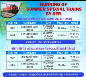 08611 Santragachi-Ajmer Special will leave Santragachi on every Monday from 07.04.2025 to 21.04.2025 at 19:55 hrs and will reach Ajmer at 15:00 hrs, the third day. In the return direction, 08612 Ajmer-Santragachi Special will leave Ajmer on every Thursday from 10.04.2025 to 24.04.2025 at 23:40 hrs and will arrive Santragachi at 14:30 hrs, the third day.