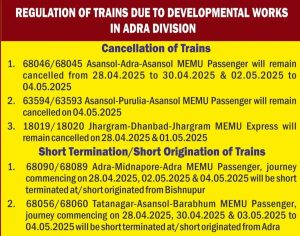 Due to Yard Remodelling works at Santragachi Station in Kharagpur division (from 30.04.2025 to 18.05.2025), it has been decided to regulate trains as per following schedule: