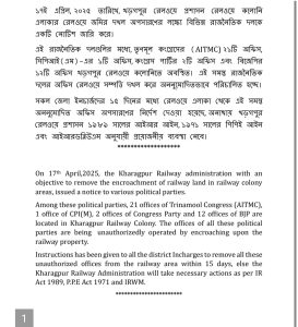 17th April,2025, the Kharagpur Railway administration with an objective to remove the encroachment of railway land in railway colony areas, issued a notice to various political parties. Among these political parties, 21 ofϐices of Trinamool Congress (AITMC), 1 ofϐice of CPI(M), 2 ofϐices of Congress Party and 12 ofϐices of BJP are located in Kharagpur Railway Colony. The ofϐices of all these political parties are being unauthorizedly operated by encroaching upon the railway property. Instructions has been given to all the district Incharges to remove all these unauthorized ofϐices from the railway area within 15 days, else the Kharagpur Railway Administration will take necessary actions as per IR Act 1989, P.P.E Act 1971 and IRWM. *********