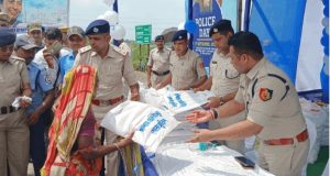 On the eve of police day SP Paschim Medinipur along with police distributed 10000 Saree, clothes and mosquito net etc to the flood affected people of Ghatal.
