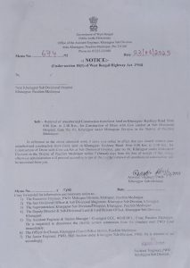 सनद रहे खड़गपुर शहर में सरकारी जमीन पर अवैध निर्माण को हटाने के उद्देश्य से पश्चिम बंगाल सरकार के लोक निर्माण विभाग (PWD) द्वारा एक महत्वपूर्ण नोटिस जारी किया गया है। यह कार्रवाई खड़गपुर सब-डिविजनल अस्पताल के गेट नंबर 01 से लेकर 2.48 किलोमीटर तक खड़गपुर-केशिया रोड ( चांदमारी से कौशल्या तक) किनारे स्थित अवैध निर्माणों को हटाने के लिए की जा रही है।
