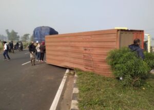 ट्रक को ओवरटेक करने के चक्कर में ट्रक समेत यात्रियों से भरी बस पलट गई, कई लोग घायल